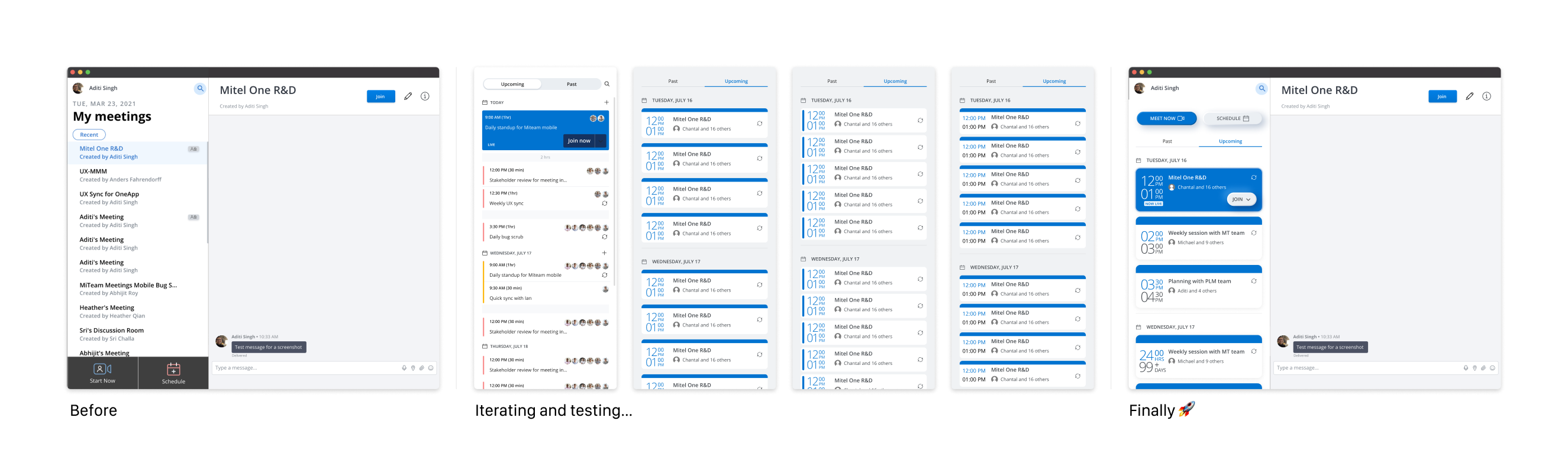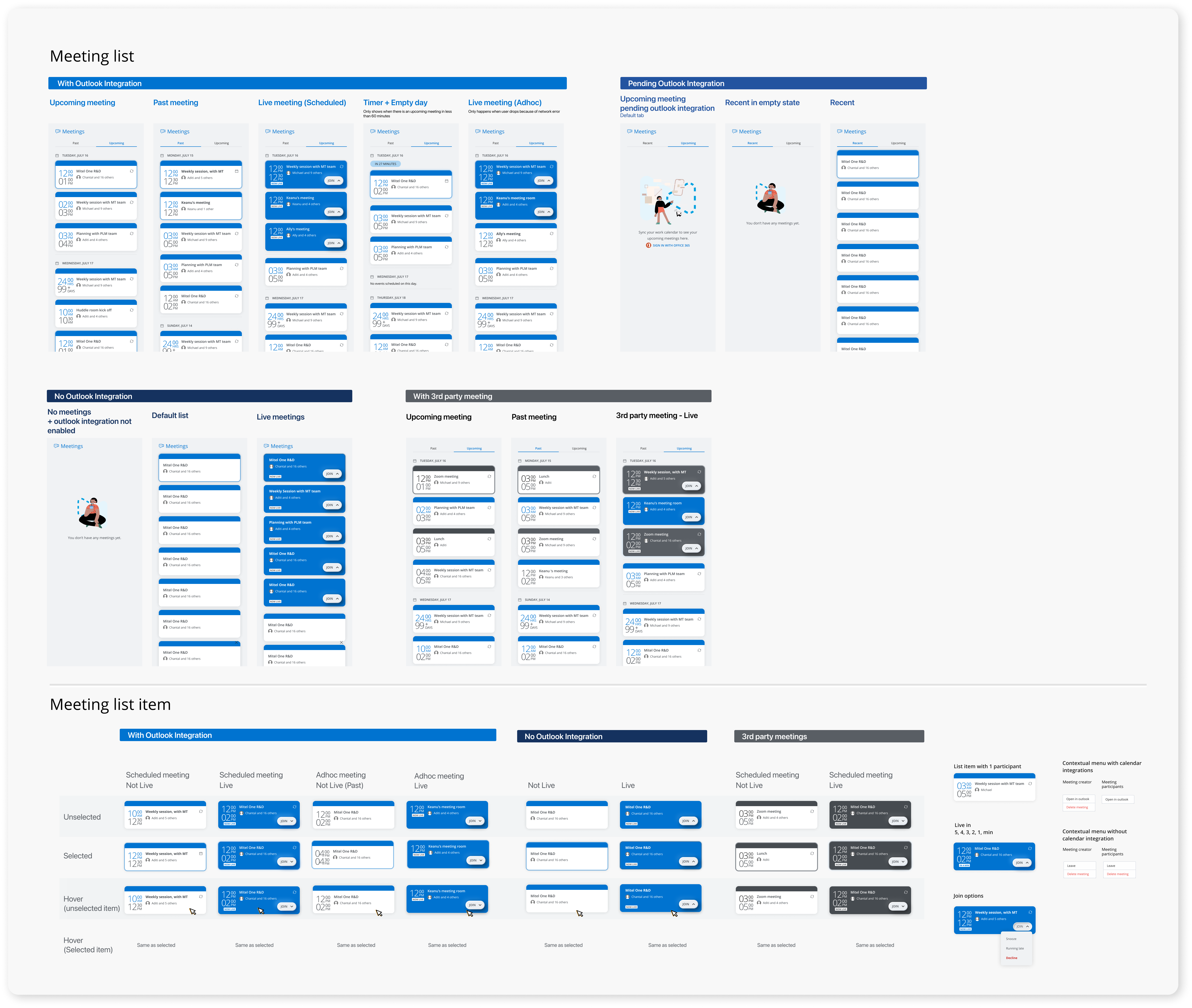Over the past year, Mitel’s business strategy has been focussing on consolidating all the products acquired via M&A into Mitel’s unified communication app, Mitel One. I have been leading all the design effort of integrating the video component in Mitel One. We brought over the meeting lists and in-meeting experience from MiTeam Meetings. This was the right time to revisit the meetings page.