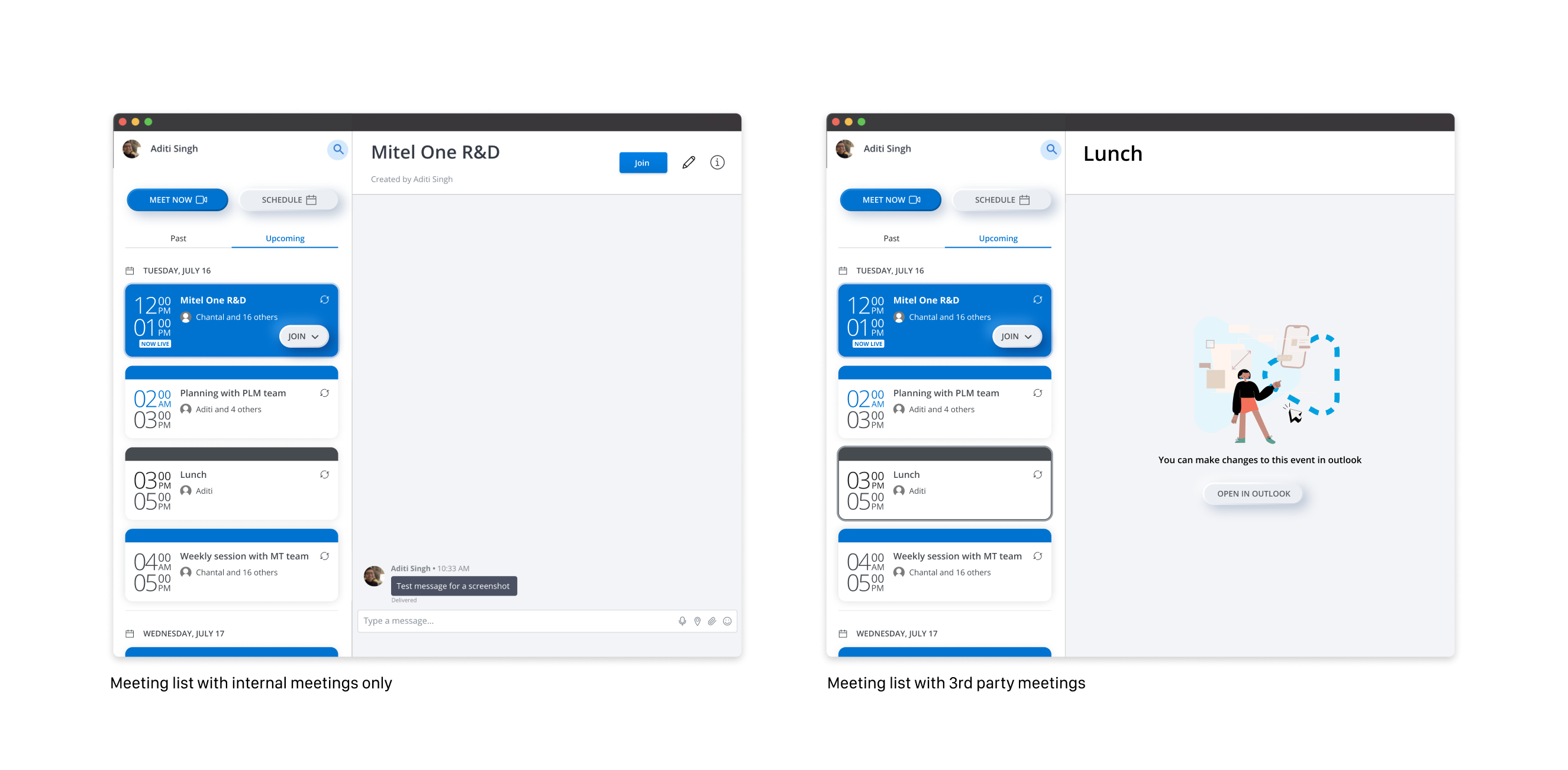 💬 The chat window occupied 75% of the meetings page. Mitel One was going to have a dedicated page for messages and having two similar looking pages filled with message would be very confusing for the users.